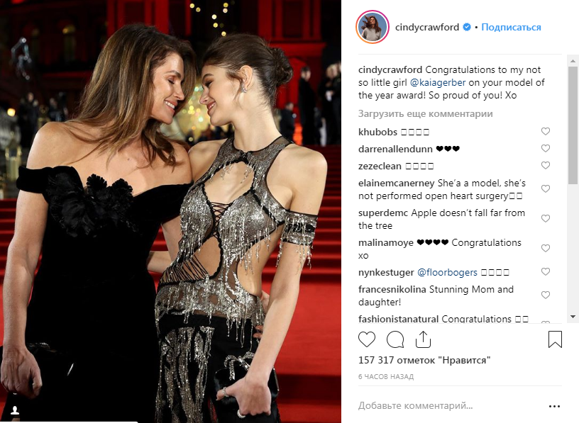 Сообщается, что Fashion Awards - это аналог премии "Оскар", только для моделей. Ее Кайя Гербер получила впервые. Между тем, 52-летняя Синди Кроуфорд сопровождала дочь, в том числе, на красной дорожке. В своем Instagram она выложила фото с церемонии награждения и отметила, что очень гордиться своим ребенком.