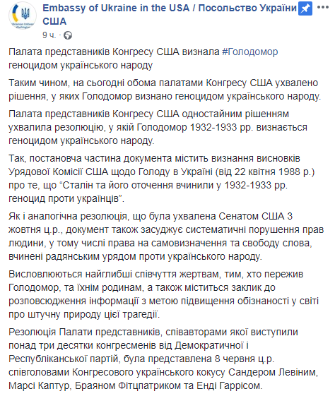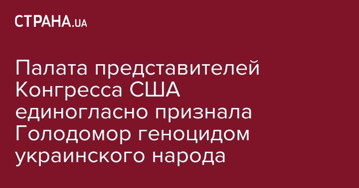 Палата представителей Конгресса США единогласным решением приняла резолюцию, в которой Голодомор в Украине 1932-1933 гг. признается геноцидом. Теперь данное решение принято обеими палатами Конгресса США. Об этом сообщает пресс-служба Посольства Украины в США на своей странице в Facebook.