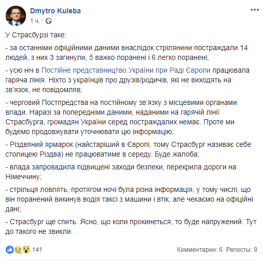 По предварительным данным, среди пострадавших в результате стрельбы в Страсбурге 11 декабря украинцев нет. Об этом сообщил постпред Украины при совете Европы Дмитрий Кулеба на своей странице в Facebook.