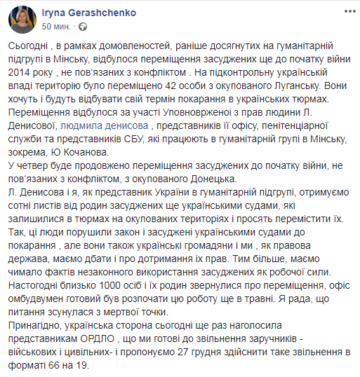 12 декабря впервые была осуществлена передача Украине осужденных с неподконтрольной территории Луганской области для дальнейшего отбывания наказания. Об этом сообщила уполномоченный Верховной Рады по правам человека Людмила Денисова на своей странице в Facebook.