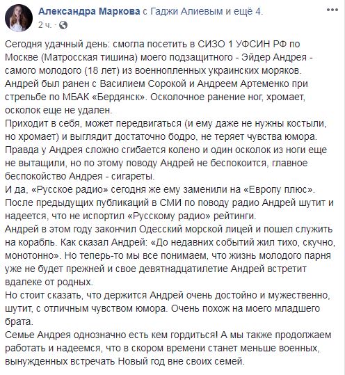 Адвокат Александра Маркова сообщает, что самому молодому 18-летнему украинскому моряку Андрею Эйдеру российские тюремщики заменили по его просьбе "Русское радио" на "Европу плюс". Также член команды защитников украинских военнопленных Мария Куракина 12 декабря посетила в "Матросской тишине" раненого моряка Андрея Артеменко и рассказала о его состоянии. Об этом сообщает Украинская правда.