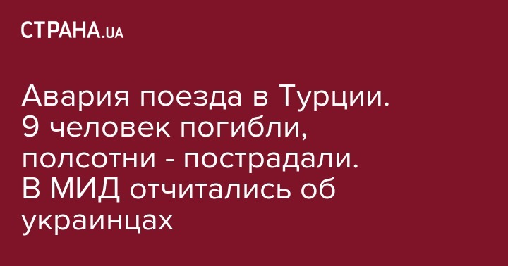 Украинцев нет среди пострадавших и погибших в результате железнодорожной катастрофы в Турции, когда скоростной поезд, следовавший по маршруту Анкара - Конья, сошел с рельсов. Об этом со ссылкой на данные МИД Украины пишет "Громадське".