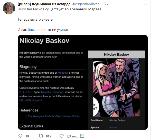 Девушка выложила скриншот фанатского сайта Marvel Cinematic Universe, который использует ту же структуру, что и Википедия и посвящен вселенной Marvel. На странице указано, что Николай Басков встречается в комиксе The Avengers Prelude: Black Widow Strikes ("Мстители. Вступление: Черная вдова атакует"). Выпуск посвящен русской шпионке, агенту Щ.И.Т.а Наташе Романофф.