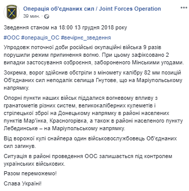 В четверг, 13 декабря, в районе проведения ООС на Донбассе от пули снайпера погиб украинский военнослужащий. Об этом сообщил пресс-центр штаба операции в вечерней сводке на своей странице в Facebook.