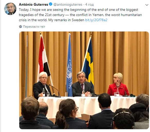 "Сегодня мы наблюдаем начало конца одной из самых больших трагедий XXI века - конфликта в Йемене, самого тяжелого гуманитарного кризиса в мире", - написал Гутерреш в своем Twitter.