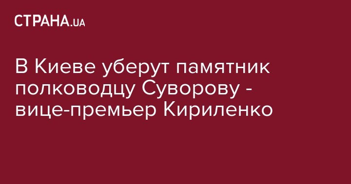 В Киеве уберут памятник российскому полководцу Александру Суворову, который установлен у входа в Киевский военный лицей имени Ивана Богуна (бывшее Суворовское военное училище - Прим.Ред.), будет демонтирован. Об этом вице-премьер-министр Украины Вячеслав Кириленко сообщил своем в Twitter .