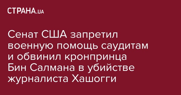Сенат США большинством голосов поддержал резолюцию, в которой говорится, что США прекращают оказывать военную помощь Саудовской Аравии в гражданской войне в Йемене. Кроме этого, сенаторы возложили ответственность за убийство журналиста Джамаля Хашогги на саудовского кронпринца Мухаммеда Бин Салмана.