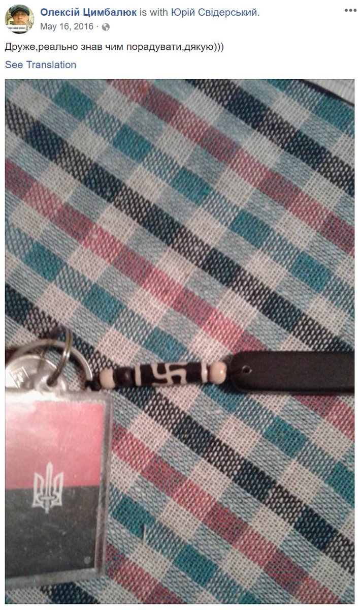 Еще на одном фото Цымбалюк очень радуется подарку со свастикой.
