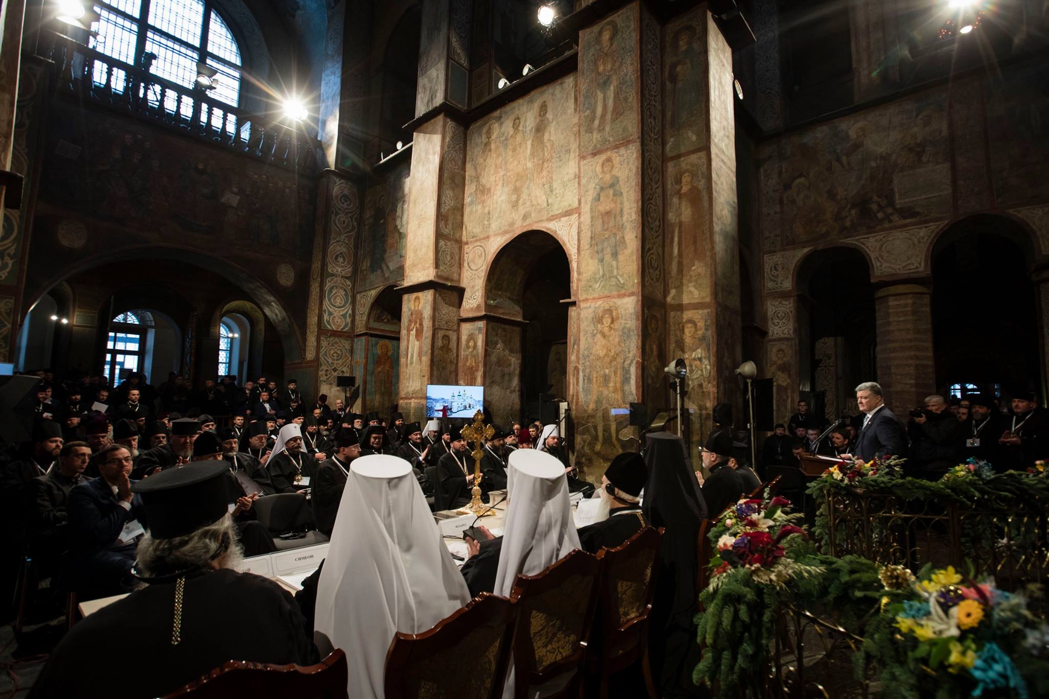 Президент рассказал, что в зале собора сидит Виктор Ющенко, который и начал процесс автокефалии. Потом перешел на аннексию Киевской митрополии Москвой в 17 веке.