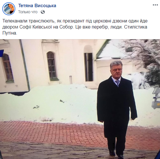 "Телеканалы транслируют, как президент под церковные колокола один идет по двору Софии Киевской на Собор. Это уже перебор, люди. Стилистика Путина", - пишет журналистка Татьяна Высоцкая в Facebook.