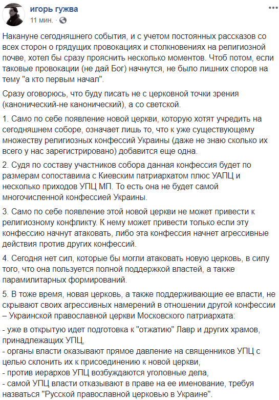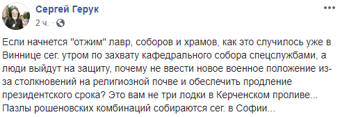 "Если начнется "отжим" лавр, соборов и храмов, как это случилось уже в Виннице сег. утром по захвату кафедрального собора спецслужбами, а люди выйдут на защиту, почему не ввести новое военное положение из-за столкновений на религиозной почве и обеспечить продление президентского срока? Это вам не три лодки в Керченском проливе...