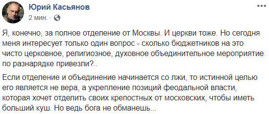 Если отделение и объединение начинается со лжи, то истинной целью его является не вера, а укрепление позиций феодальной власти, которая хочет отделить своих крепостных от московских, чтобы иметь больший куш. Но ведь бога не обманешь...", - пишет в Facebook волонтер Юрий Касьянов.