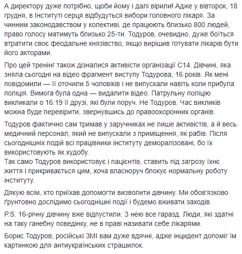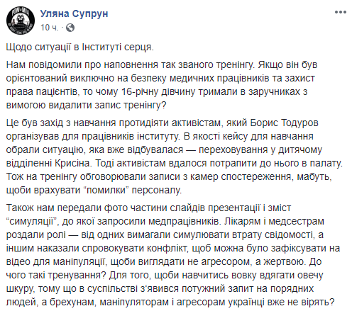 Глава Института сердца Борис Тодуров якобы организовал специальный тренинг, где обучал сотрудников учреждения симулировать потерю сознания, а другим приказал спровоцировать конфликт в случае конфликта с националистами. Так утверждает в Facebook и.о. министра здравоохранения Ульяна Супрун, которая таким образом фактически поддержала нападение ультраправых из С14 на Институт сердца (подробности этого конфликта можно прочитать здесь).