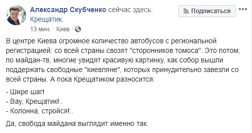 "В центре Киева огромное количество автобусов с региональной регистрацией: со всей страны свозят "сторонников томоса". Это потом, по майдан-тв, многие увидят красивую картинку, как собор вышли поддержать свободные "киевляне", которых принудительно завезли со всей страны", - написал он.