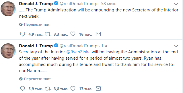 Президент США Дональд Трамп объявил, что министр внутренних дел США Райан Зинке покинет свой пост до конца года. Об этом он написал в своем Twitter.
