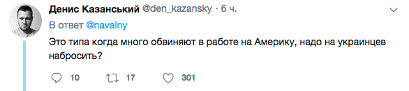 Так, Денис Казанский обратился к российскому оппозиционеру с таким вопросом: "Это типа когда много обвиняют в работе на Америку, надо на украинцев набросить?