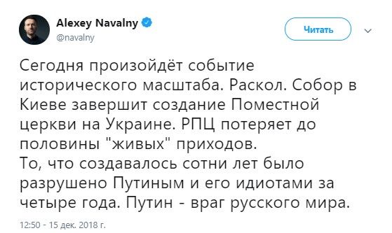 "Сегодня состоится событие исторического масштаба. Раскол. Собор в Киеве завершит создание Поместной церкви в Украине. РПЦ потеряет до половины "живых" приходов. То, что создавалось сотни лет было разрушено Путиным и его идиотами за четыре года. Путин - враг русского мира", - написал Навальный.