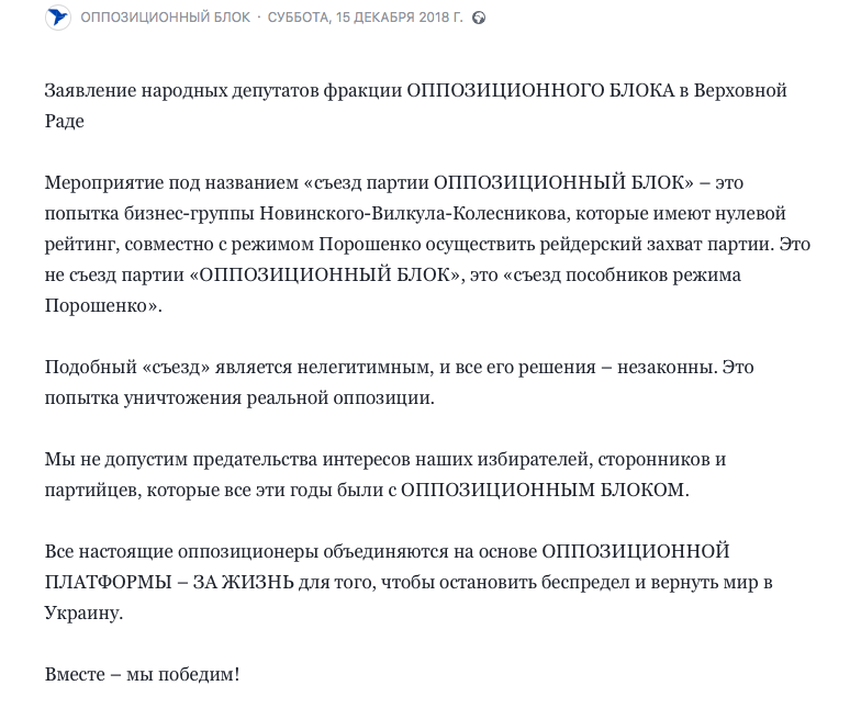 Сегодняшний съезд "Оппозиционного блока" нелегитимен и является рейдерской атакой на партию, организованной властью для раскола оппозиции. Об заявили на Facebook-странице партии народные депутаты фракции Оппоблока в Верховной Раде, которые ориентируются на Юрия Бойко.