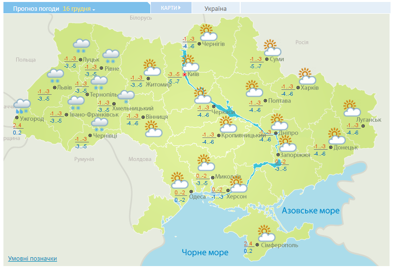 В воскресенье, 16 декабря, в Украине сохранится прохладная и морозная погода. Об этом сообщает Укргидрометцентр.