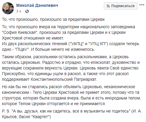 "Из двух раскольнических течений (УАПЦ и УПЦ КП) создали теперь одно – ПЦУ. И больше ничего не изменилось. Таким образом, раскольники остались раскольниками, а Церковь осталась Церковью. Радостно и отрадно, что епископат, духовенство и верующие сохранили верность Церкви. Церковь явила свое единство", - считает отец Николай.
