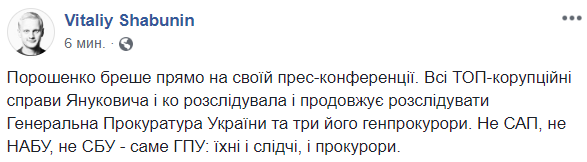 17:03  "Порошенко врет прямо на своей пресс-конференции. Все ТОП-коррупционные дела Януковича и ко расследовала и продолжает расследовать Генеральная Прокуратура Украины и три его генпрокурора. НЕ САП, а не НАБУ, не СБУ - именно ГПУ: их и следователи, и прокуроры", - реагирует на слова президента антикоррупционный активист Виталий Шабунин.