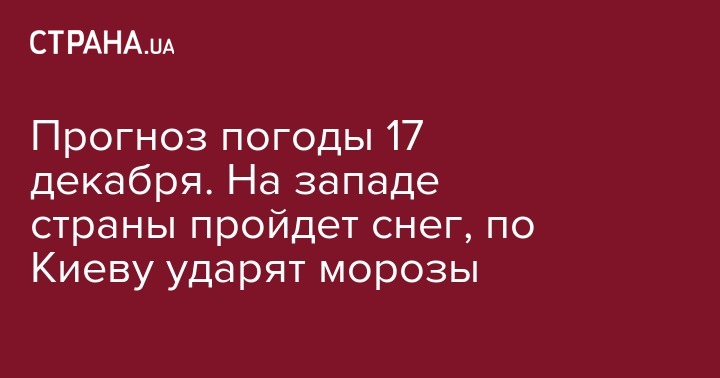 В понедельник, 17 декабря, в Украину придет похолодание, в большинстве областей прогнозируют без существенных осадков, а в западных областях выпадет снег. Об этом сообщает Укргидрометцентр.