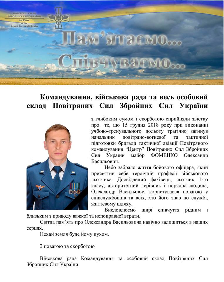 Во время крушения многоцелевого истребителя погиб военный летчик первого класса, майор Александр Фоменко.