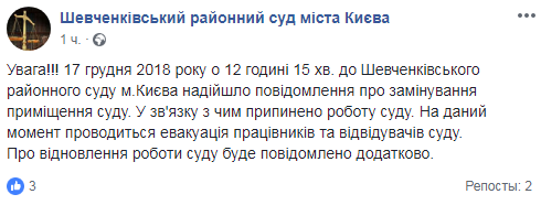 В 12:15 понедельника, 17 декабря, в Шевченковский райсуд Киева вновь поступило сообщение о минировании здания. Работа суда была остановлена. Об этом говорится на странице пресс-службы суда в Фейсбуке.