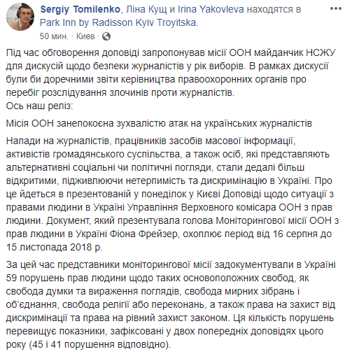 Документ представила председатель Мониторинговой миссии ООН по правам человека в Украине Фиона Фрейзер. Об этом сообщает глава НСЖУ Сергей Томиленко на своей странице в Facebook.