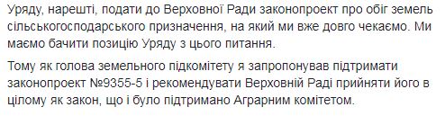 "Оптимальным сроком (продления моратория - Прим. Ред.) я считаю один год, как предлагается законопроектом № 9355-5. В этом же законопроекте содержится обязанность правительства, наконец, подать в Верховную Раду законопроект об обороте земель сельскохозяйственного назначения, который мы уже долго ждем. Мы должны видеть позицию правительства по этому вопросу. Потому я как председатель земельного подкомитета предложил поддержать законопроект №9355-5 и рекомендовать Верховной Раде принять его в целом как закон, что и было поддержано аграрным комитетом", - написал Кулинич.