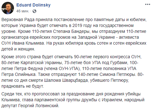 "На руках юбиляра кровь сотен и сотен еврейских детей и женщин. Кроме этого страна будет отмечать 90-летие первого конгресса ОУН, 80-летие Карпатской Украины, 75-летие боя УПА под Гурбами, 100-летие Петра Федуна (члена ОУН-УПА), 110-летие полковника УПА Петра Олийныка. Также отпразднуют 140-летие Симона Петлюры", - сообщил Долинский.