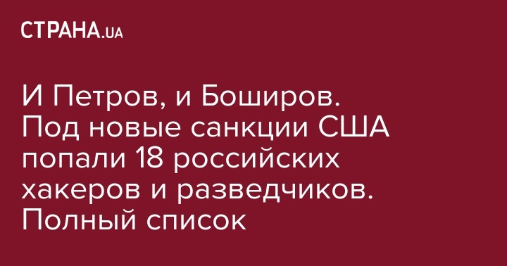 Также Минфин перечислил других россиян, против которых введены санкции: Борис Антонов (ГРУ), Виктор Бояркин (связан с Олегом Дерипаской), Елена Хусяинова (связана с "Конкорд менеджмент"), Анатолий Ковалев (ГРУ), Николай Козачек (ГРУ), Алексей Лукашев (ГРУ), Александр Малькевич (связан с информационным агентством USA Really), Артем Малышев (ГРУ), Алексей Минин (ГРУ), Алексей Моренец (ГРУ), Виктор Нетыкшо (ГРУ), Александр Осадчук (ГРУ), Алексей Потемкин (ГРУ), Евгений Серебряков (ГРУ), Олег Сотников (ГРУ), Иван Ермаков (ГРУ).