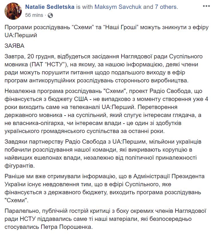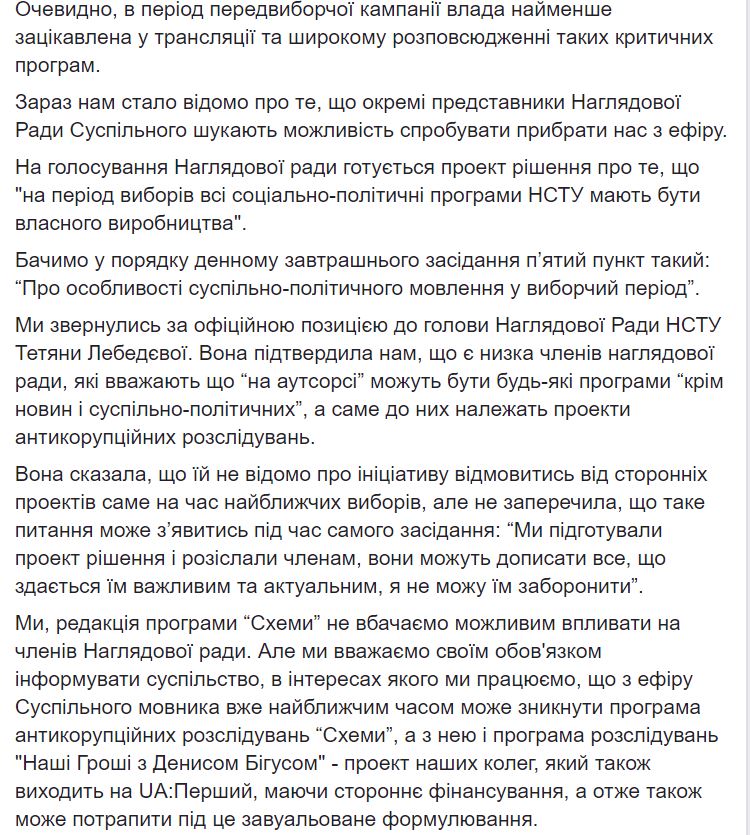 "Мы, редакция программы "Схемы" не видим возможным влиять на членов Наблюдательного совета. Но мы считаем своим долгом информировать общество, в интересах которого мы работаем, что с эфира Общественного вещателя уже в ближайшее время может исчезнуть программа антикоррупционных расследований "Схемы", а с ней и программа расследований "Наши Деньги с Денисом Бигусом" - проект наших коллег, который также выходит на UA:Первый, имея инородное финансирования, а следовательно также может попасть под эти завуалированные формулировки.