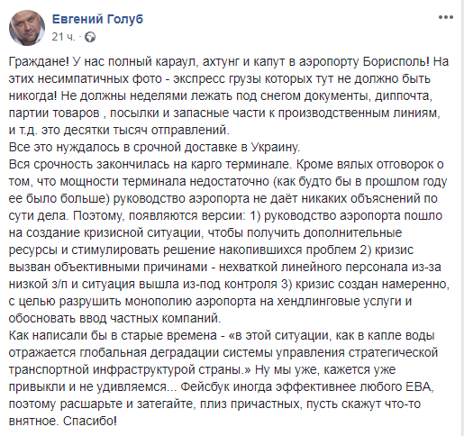 "Не должны неделями лежать под снегом документы, диппочта, партии товаров, посылки и запасные части к производственным линиям, и т.д., а это десятки тысяч отправлений. Все это нуждалось в срочной доставке в Украину", - написал на своей странице в Facebook киевлянин Евгений Голуб.