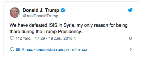 Причиной, побудившей Трампа к такому шагу, стало то, что "США одержали победу над ИГИЛ в Сирии".  "Это была единственная причина, по которой мы находились там во время моего президентства", – написал президент Соединенных Штатов на своей странице в Twitter.