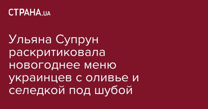И.о. министра здравоохранения Ульяна Супрун раскритиковала традиционный новогодний стол украинцев, на котором оливье, селедка под шубой, запеченная утка, салат с крабовыми палочками, торт медовик, а также холодец, голубцы и сырники.