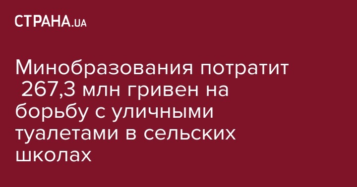 В 2019 году Министерство образования выделит 267,3 миллионов гривен на туалеты в сельских школах. Об этом со ссылкой на первого заместителя министра образования и науки Павла Хобзея пишут "Украинские новости".