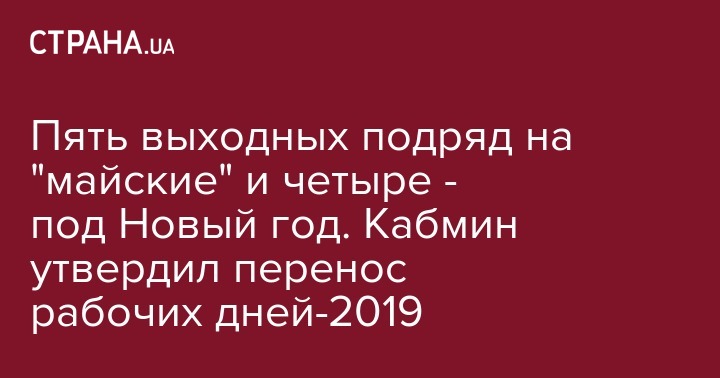 Сегодня, 10 января, Кабмин утвердил перенос рабочих дней в 2019 году, проект которого был представлен накануне. Об этом сообщает Интерфакс-Украина со ссылкой на текст постановления правительства.