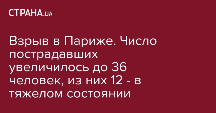 В результате взрыва в Париже, который произошел сегодня в 9:00 в пекарне, пострадали 36 человек, 12 из которых получили тяжелые ранения. Об этом сообщает Franceinfo со ссылкой на пожарных.