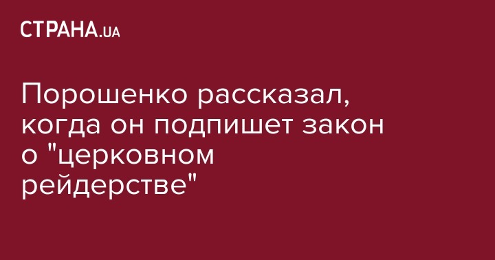 Во вторник, 22 января, президент Украины Петр Порошенко заявил, что подпишет закон "о церковном рейдерстве", определяющий процедуру перехода церковных общин в Православную церковь Украины, в ближайшие дни. Об этом глава государства заявил в ходе чествования Дня соборности Украины, сообщает "Интерфакс"
