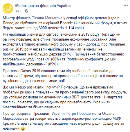 "...Во-первых, [мы - Украина] уже учитываем глобальные риски в планировании и прогнозировании своего развития, во-вторых, успешно развиваем экономику и наш ВВП растет уже 11 кварталов подряд, в-третьих, это свидетельствует о привлекательности Украины как иневстиционного и бизнес-партнера. Об этом, в частности, президент Украины Петр Порошенко и Оксана Маркарова будут говорить с директором-распорядительницей МВФ Кристин Лагард на втором заседании Инвестиционного совета", - сказано в сообщении.