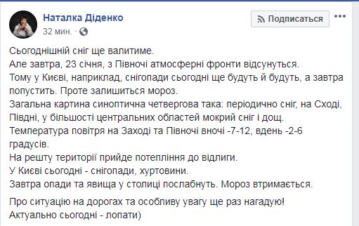 "Общая картина синоптическая четверговая такая: периодически снег, на востоке, юге, в большинстве центральных областей мокрый снег и дождь. Температура воздуха на западе и севере ночью -7...-12 градусов, днем -2...-6 градусов. На остальную территорию придет потепление до оттепели", - сообщает Диденко. Но сегодня, по ее данным, снегопад, в том числе в Киеве, продолжится и "актуальными будут лопаты".