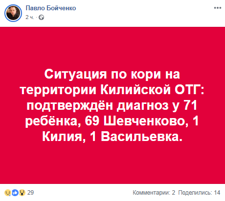 В селе Шевченково Одесской области, где по состоянию на 22 января 58 детей болели корью, 23 января диагноз подтвержден у 69 детей. Всего в Килийской ОТГ, куда входит населенный пункт, этим заболеванием болеет 71 ребенок. Об этом написал глава громады Павел Бойченко на своей странице в Facebook.