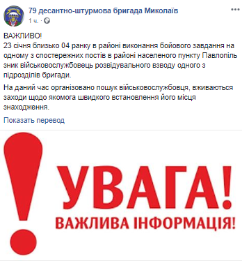 "23 января около 4 утра в районе выполнения боевой задачи на одном из наблюдательных постов в районе населенного пункта Павлополь исчез военнослужащий разведывательного взвода одного из подразделений бригады", - говорится в сообщении.