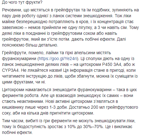 По словам Супрун, грейпфрут, помело, лаймы и горькие апельсины ускоряют попадание лекарственных препаратов в кровь, (биодоступность), что приводит к серьезным последствиям для организма человека.