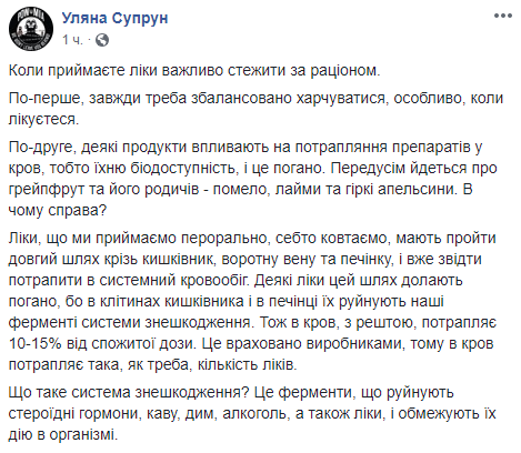 Глава Минздрава Ульяна Супрун, которая советует украинцам есть меньше черной икры, сообщила о важности сбалансированного питания во время лечения и приема лекарств. Об этом она написала на своей странице в Facebook.