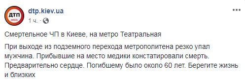 В Киеве на выходе из подземного перехода метрополитена 23 января умер мужчина. Инцидент произошел на станции метро "Театральная". Об этом сообщает dtp.kiev.ua на своей странице Facebook.