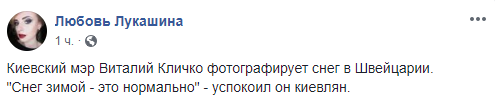 Любовь Лукашина иронизирует, что Кличко из Швейцарии успокаивал киевлян, что снег - это нормально.