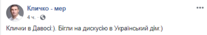 Кирилл Куликов отмечает, что Кличко поехал в Давос, чтобы участвовать в панельной дискуссии "Разумное финансирование умных городов."Тот, кто зарегистрировал Витальку на эту панель - троль", - написал она.