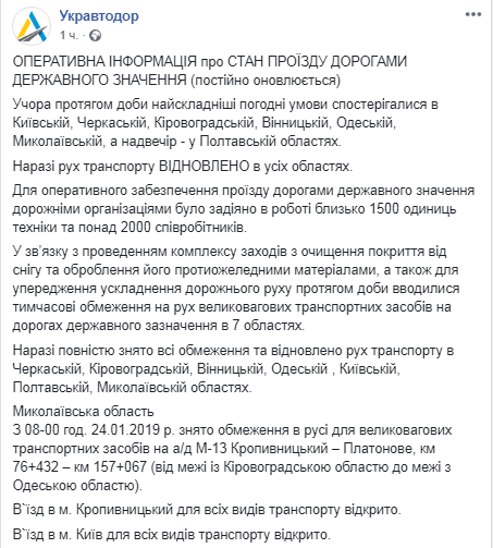 По состоянию на утро четверга, 24 января, во всех областях Украины обеспечен проезд по трассам государственного значения - в том числе, на тех участках, где движение транспорта частично ограничивалось из-за снегопада 23 января. Об этом на своей странице в Facebook сообщает "Укравтодор".